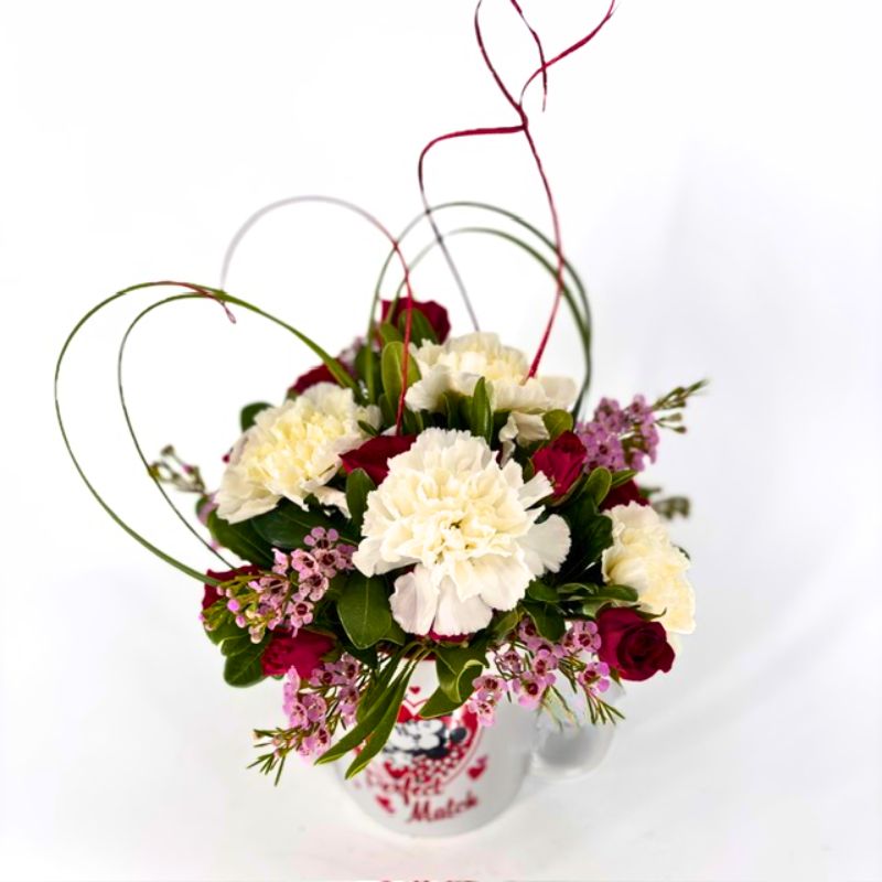 It is filled to the brim with colorful floral featuring red spray roses, white carnations and pink wax flower accents. This heart-warming design depicts Minnie Mouse bestowing a kiss to Mickey Mouse with multi-heart accents.