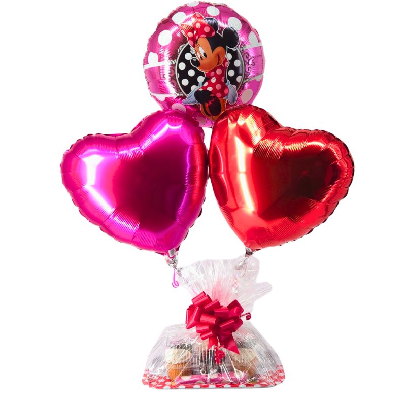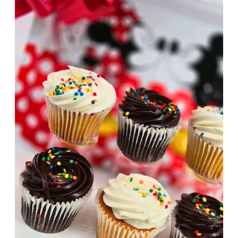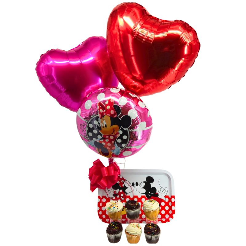 The perfect way to celebrate any occasion! A half-dozen of mixed chocolate and vanilla cupcakes presented on an adorable Mickey Mouse & Minnie Mouse metal tray. Each package is adorned with a Minnie Mouse themed balloon cluster. Whether it is an anniversary, birthday, graduation or any other life celebration, this is a sweet way to celebrate!!