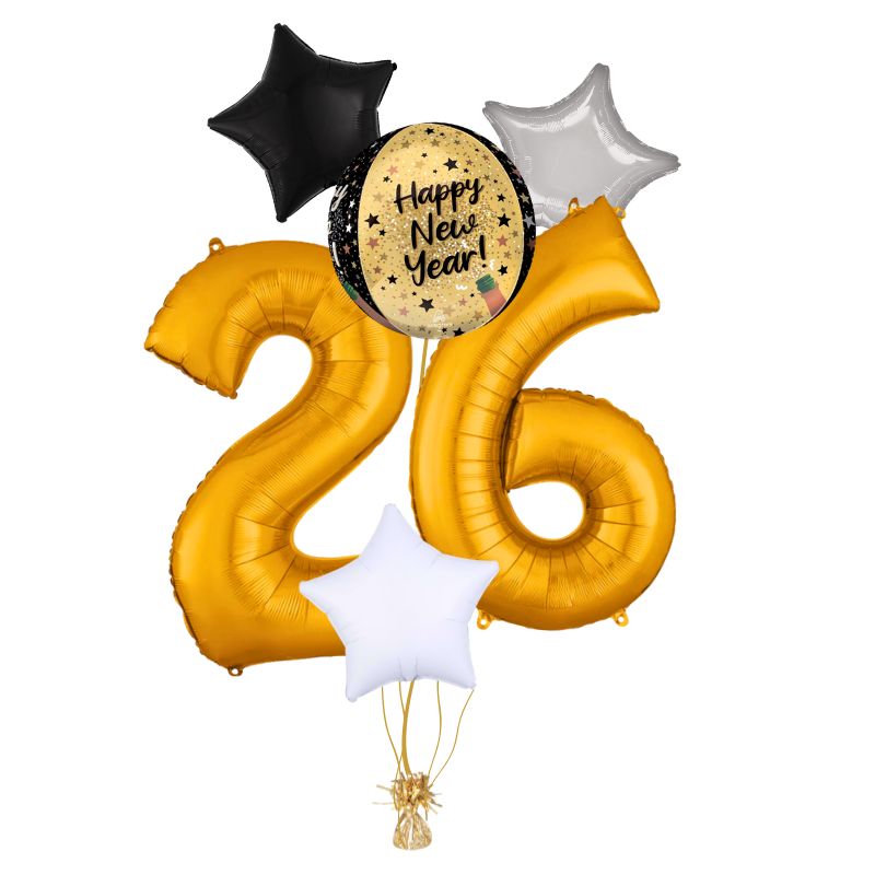 Get your resolutions ready as we count down to the New Year! This festive balloon bouquet is the perfect way to ring in the New Year! The oversized numbers "2" and "6" create a striking focal point, while the New Year's Eve Orbz balloon adds a touch of sparkle and celebration. The solid-colored star balloons complete the festive look.