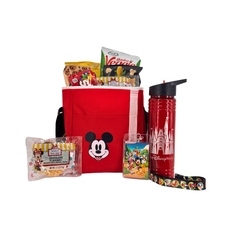 It is filled with assorted snacks and treats, a refillable castle water bottle and a Mickey Mouse lanyard.